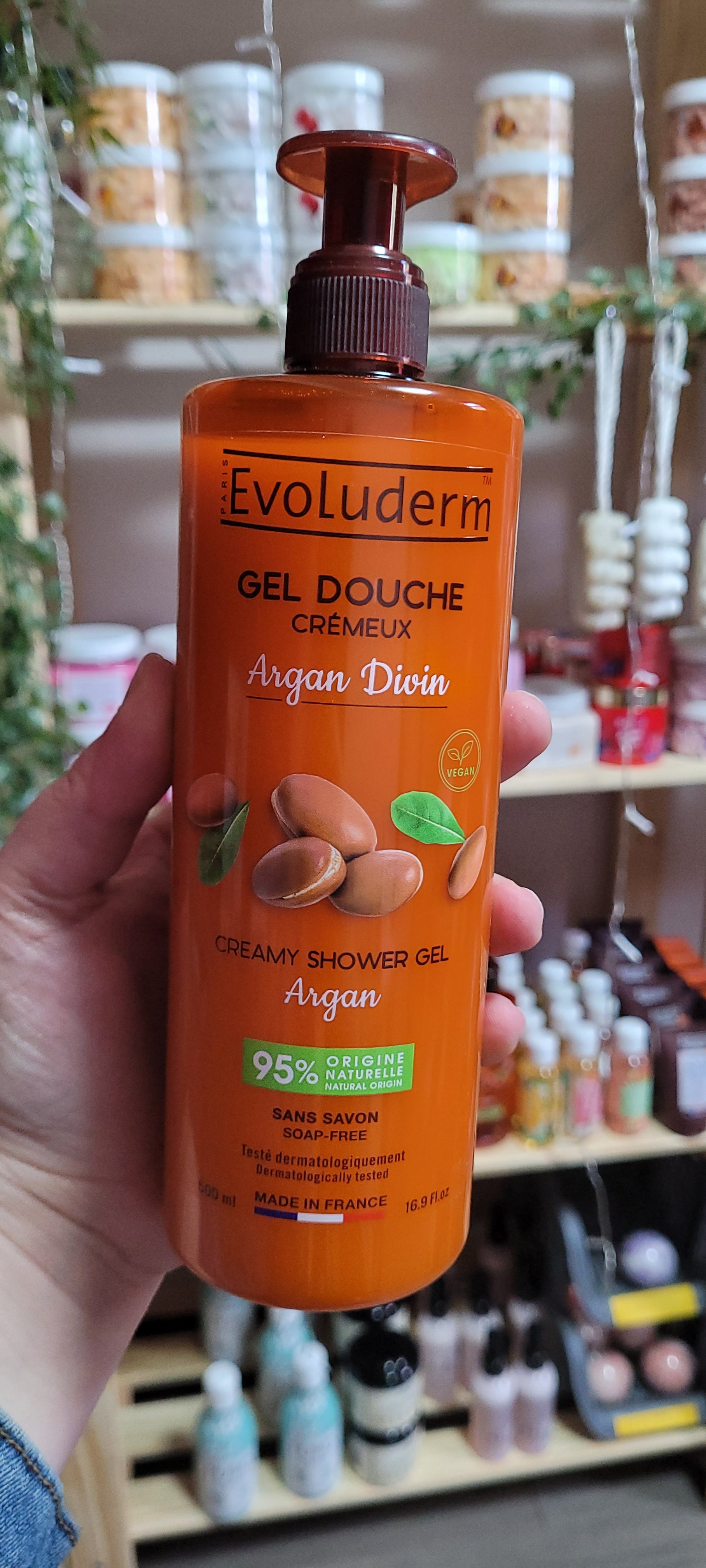 Formulé à 95% d'origine naturelle, végan et sans savon, le Gel Douche Crémeux Argan Divin est enrichi en Huile d'Argan et en Karité pour nettoyer le corps tout en douceur. Le Karité du Burkina Faso, secret de beauté des femmes africaines, protège la peau des agressions extérieures. L’Huile d’Argan du Maroc, un élixir issu de l’arganier, nourrit intensément toutes les peaux, même les plus déshydratées. La texture crémeuse de ce gel douche se transforme en une mousse généreuse qui laisse la peau souple et douce, délicatement parfumée de notes apaisantes. Résultat : parfaitement propre, la peau est revitalisée et éclatante de beauté.